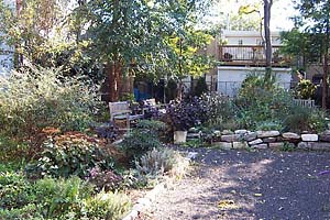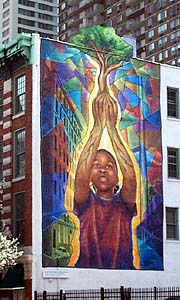 Left: Mural in 1900 block of Arch Street, opposite Pennsylvania Horticultural Scoiety headquarters. Below: Images from Fitzwater Street gardens taken October 2001 -- we visited these gardens April 6, 2002 but I didn't photograph them on that day. --Laura Blanchard |