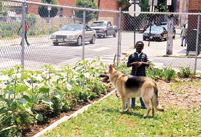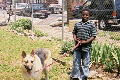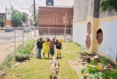 Shown here, several of the regulars, always eager to help dig and mow, not so fond of picking trash and pulling weeds. However, one of the adults on the block has recently taken over the task of keeping the walkways around the garden space clear of loose trash by sweeping and bagging. Neatly bagged trash set on the curb is certainly preferable to loose trash blowing around, and we are very pleased at this change. Just under the wall paintings is a small row of dwarf sunflowers. To its right we have planted three shrub Cornus seedlings and a sumac offset donated by the gardener at Historic Bartram's Gardens. We are still watching to see how they fare. We will probably lose the sumac unless we get new shoots from the roots; the leaves have all died. One and possibly two of the Cornus is putting out new growth. [Update: the sumac didn't make it but all three Cornus did] In the foreground at the lower right is one Pawlonia tree that we have decided to encourage for the short run to provide some shade until we have other plantings. There is a mulberry at the other end of the garden that we will allow to grow for a similar reason. |