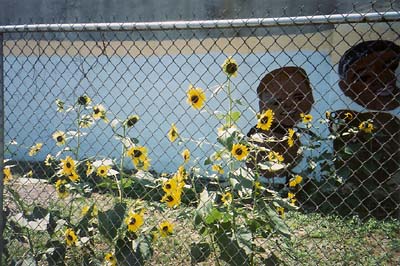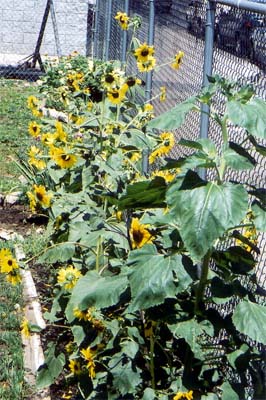 view of the sunflowers, with just a glimpse of the rudbeckia and other flowers