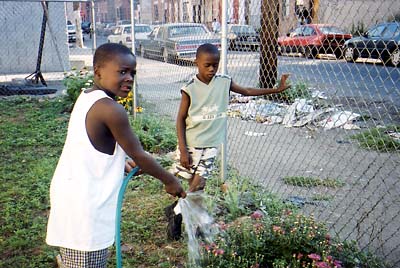 Kenyatta, left, waters one of the two original chrysanthemum plants (discovered