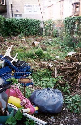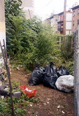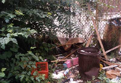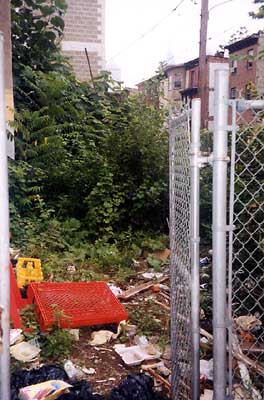 This particular shot shows the lot after two weekends' work on it. As quickly as we would remove trash and vegetation more food wrappers would be thrown over the fence. |