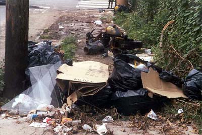 This is a view of the lot after the second or third weekend of work. We were clearing from the front to the back. We stored our trash inside the lot, because keeping trash outside the lot would encourage more of the short-dumping shown below. |