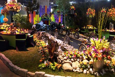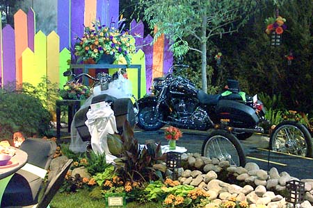 In "Love, Honor, and the Open Road," a fanciful display from Flowers by David, Miss Harley weds Mr. Davidson. Note the bustle just behind the "bride's" saddlebags.
