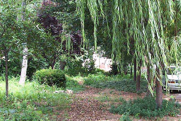 The 1900 Webster Woodland. Trees planted at curbside include willow, copper beech and linden, while trees further back include several flowering trees. The remnants of raised beds are being reclaimed and informal paths have been reinforced with a layer of woodchips.