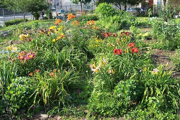Daylily garden, early July 2002. Established by a former gardener, it is a blaze of color in July and the gardeners have chosen to keep it intact.
