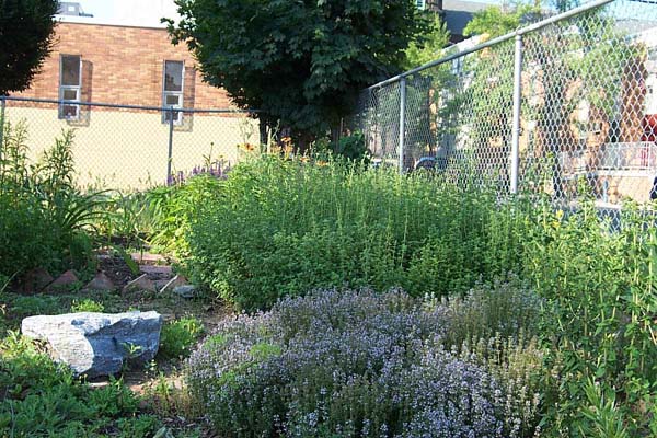 Herb garden, June 2002. Gardeners share in the maintenance and harvest.